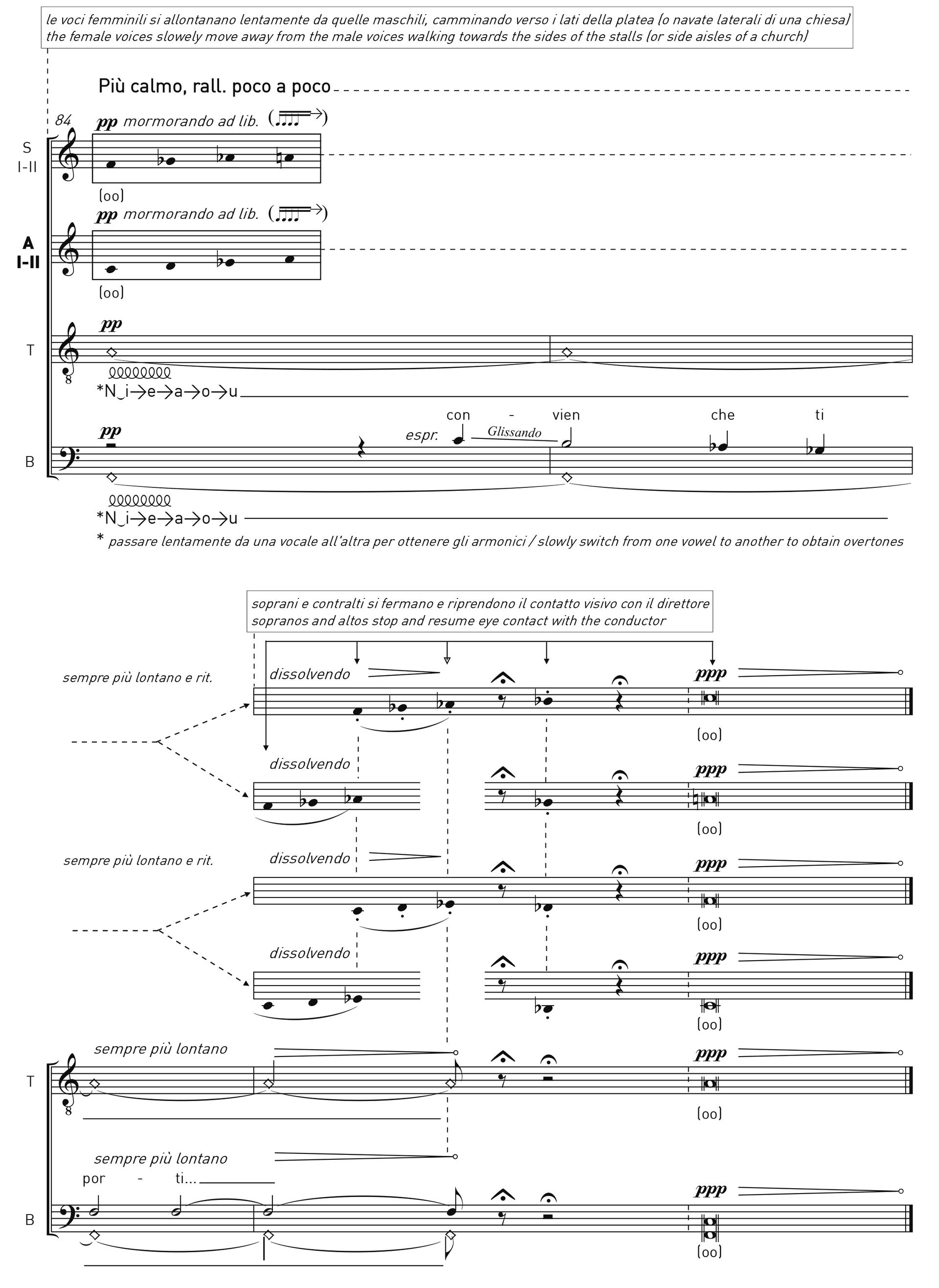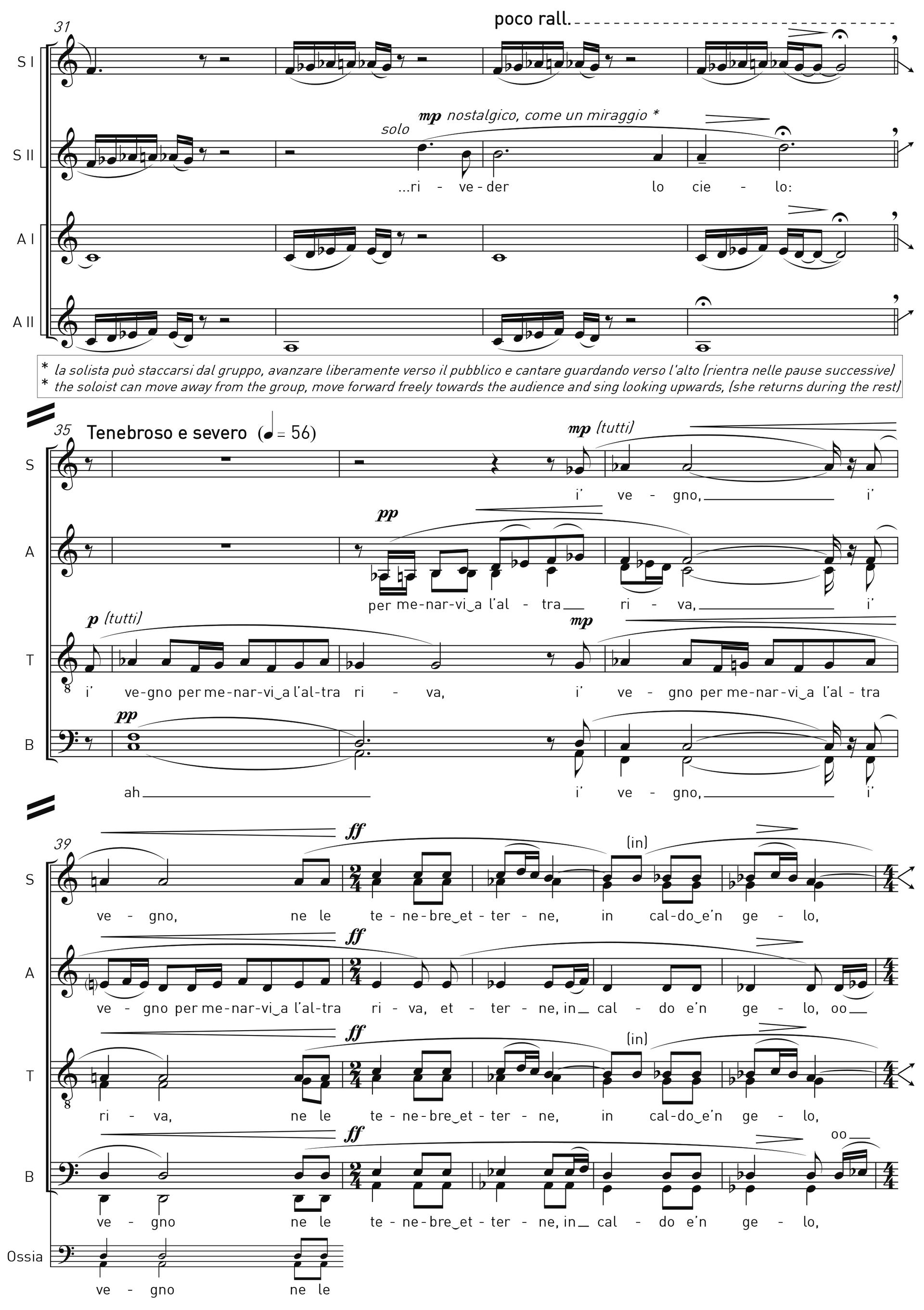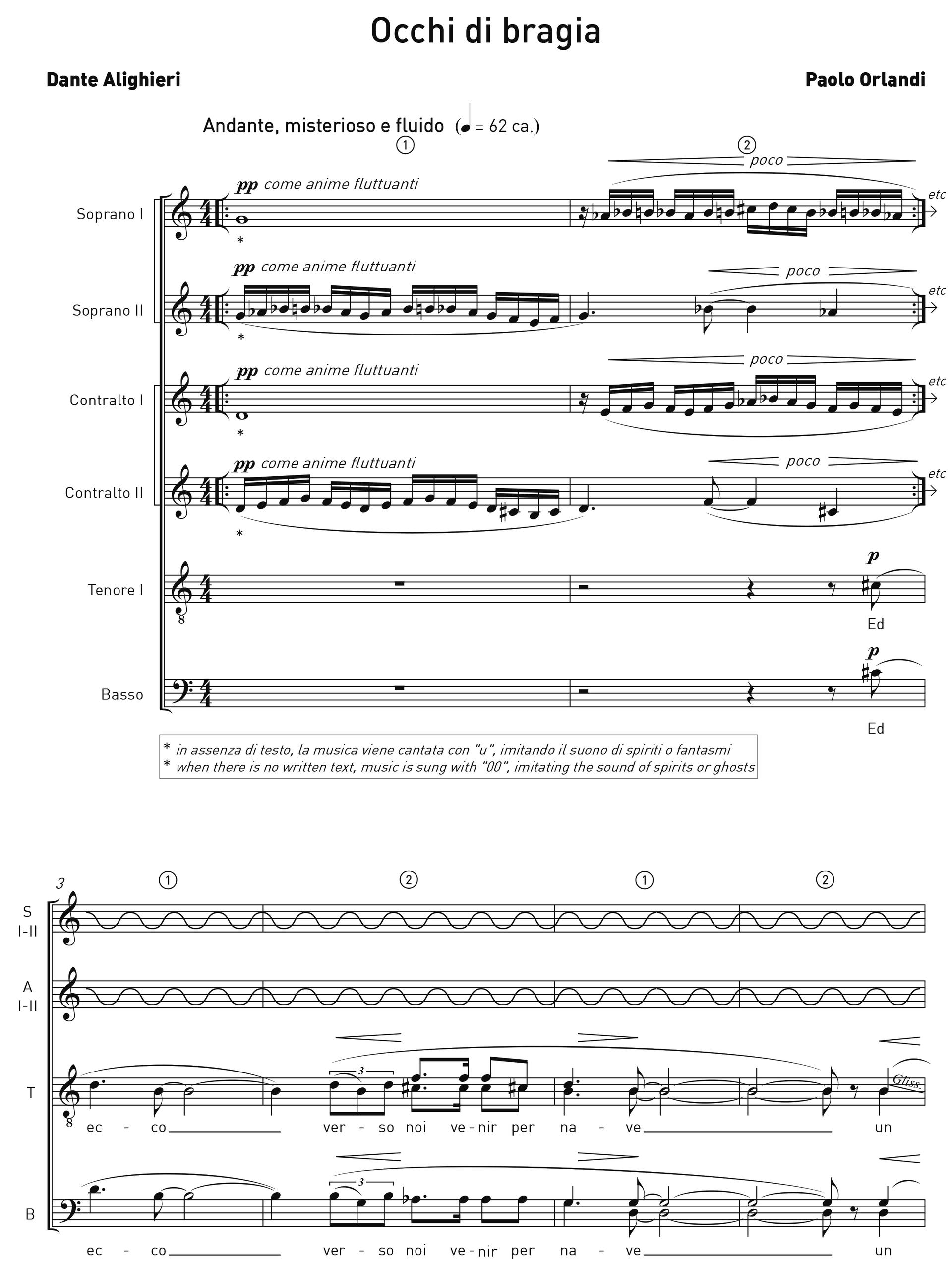 Le voci femminili si staccano dai lati e cominciano a uscire di scena allontanandosi da quelle maschili. In questa conclusione, come in altri passaggi della composizione, ho aggiunto delle indicazioni drammaturgiche in modo tale che i coristi si trasformino in veri e propri attori che coinvolgono l’ascoltatore anche attraverso lo sguardo e il movimento, oltre che con il canto. Lo spettatore diventa simbolicamente Dante stesso, e può meglio immedesimarsi nella situazione vissuta dal sommo poeta.Occhi di bragia è stato eseguito per la prima volta il 23 ottobre 2022 presso il Conservatorio G. Verdi di Torino in occasione del Concorso per direttori di coro Fosco Corti. L’esecuzione è stata affidata al Coro della Filarmonica Slovena. La composizione è pubblicata da Feniarco ed è disponibile nello shop online.