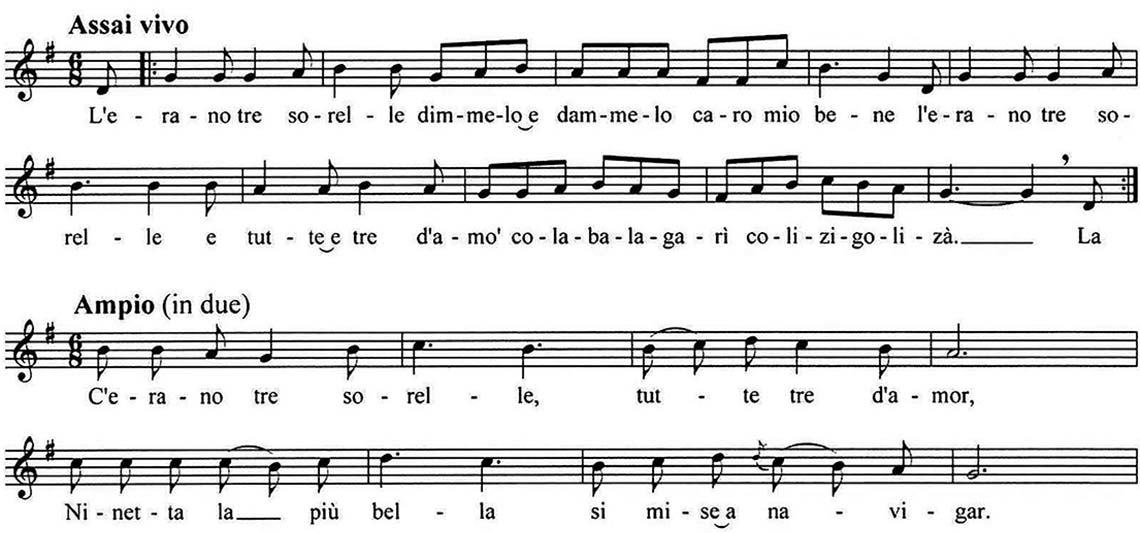 Per concludere esistono poi eclatanti casi in cui a esiti arcaici musicali diversi (anche dal punto di vista della suggestione globale) corrisponde lo stesso testo, come nell’esempio sottostante:
