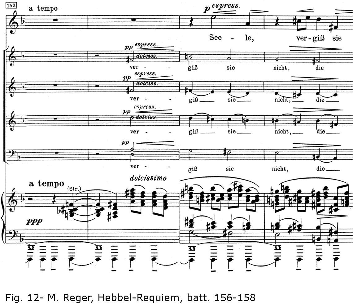 Siamo all’epilogo. Seconda ripresa di A, con ulteriori varianti. Giunti a questo punto, ci attenderemmo la chiusura della parabola formale, contrassegnata da un ritorno della fredda quinta vuota d’apertura. Invece, la terza maggiore riempie e infervora l’accordo, riaccende l’armonia e dona alle gravi pulsazioni del pedale di tonica un rinnovato afflato. Ed ecco, in un rasserenato e dolcissimo clima sonoro, l’esortazione melodica principale del solo si combina con la commovente citazione del corale di Hassler (quello stesso che Bach ha più volte utilizzato nella Matthäus-Passion): O Haupt voll Blut und Wunden. Non le parole, ma solo le note dell’antica melodia, risuonano nel canto dei soprani del coro (fig. 12). Nova et Vetera… È con un raggio di pacificazione e consolazione che termina questa bella composizione di Max Reger. A detta di alcuni, questa chiusura, va intesa come un recupero, da parte del musicista, del sentimento religioso, un superamento dell’angoscia, un superamento della negazione della speranza, che la morte, altrimenti intesa come annichilimento totale, porta con sé.